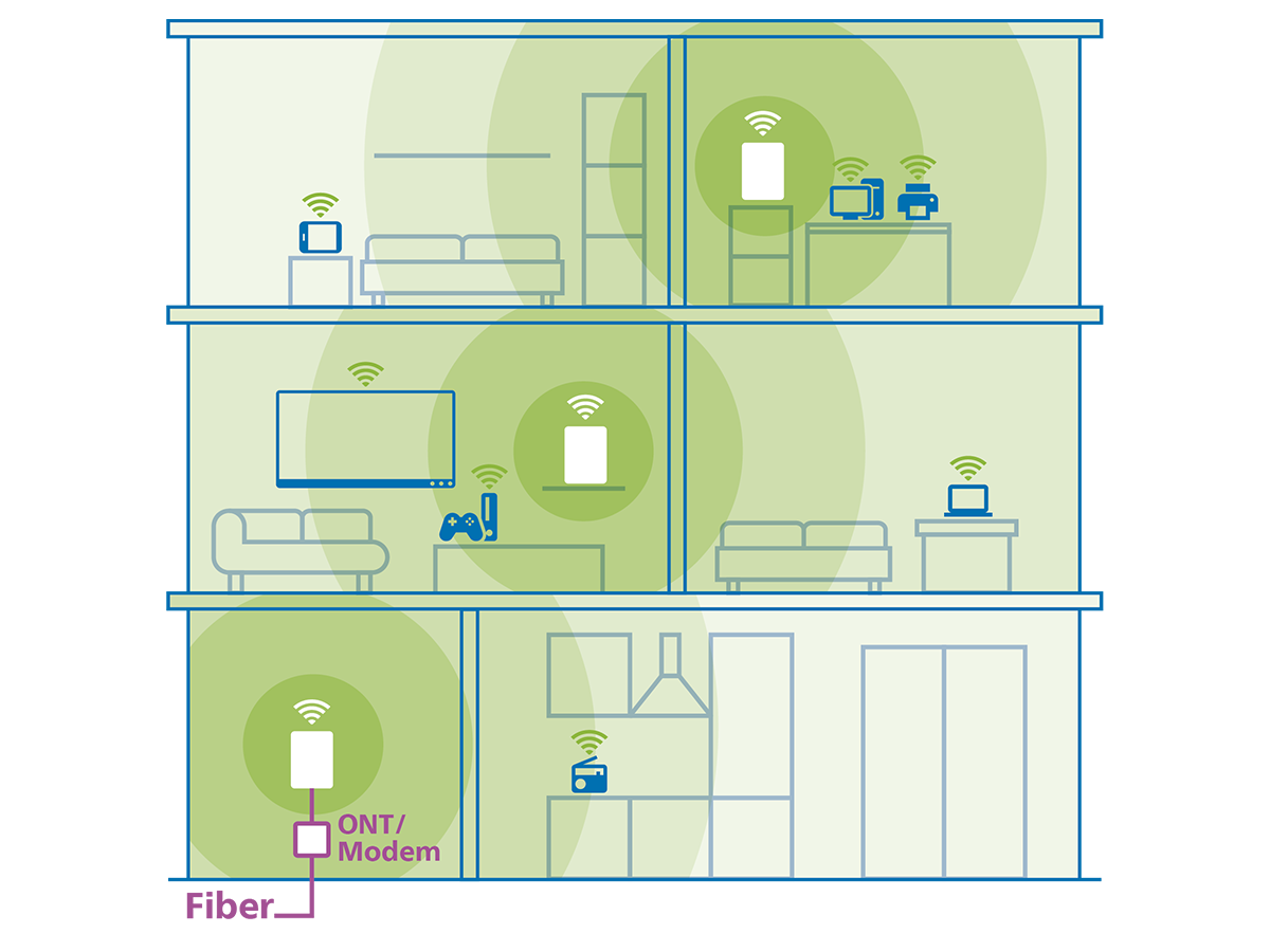 The particular strength of this solution is its flexibility. The Wi‑Fi mesh system can be operated directly at the router. Expandability to a total of five extensions also makes it easy to build a customised home network infrastructure that connects all devices—wired or wireless—via tri‑band technology and gigabit ports.